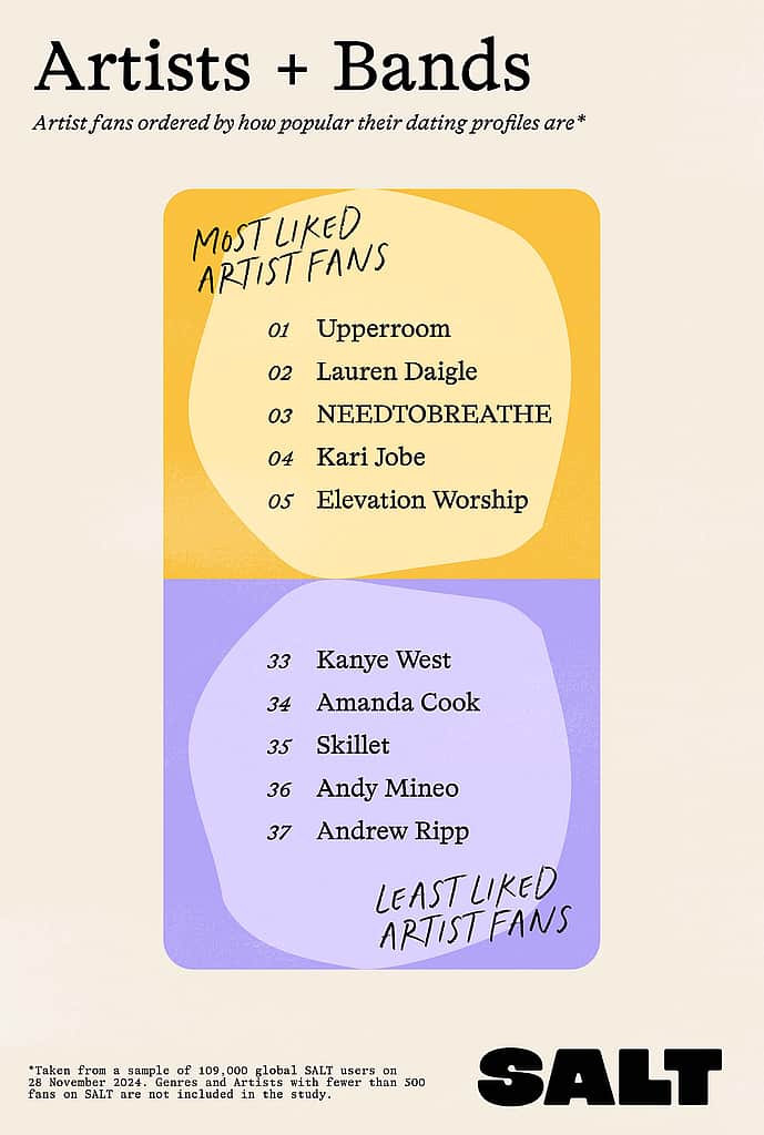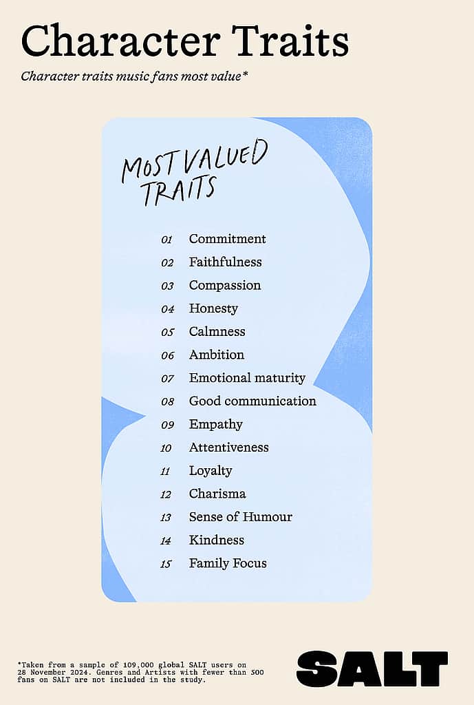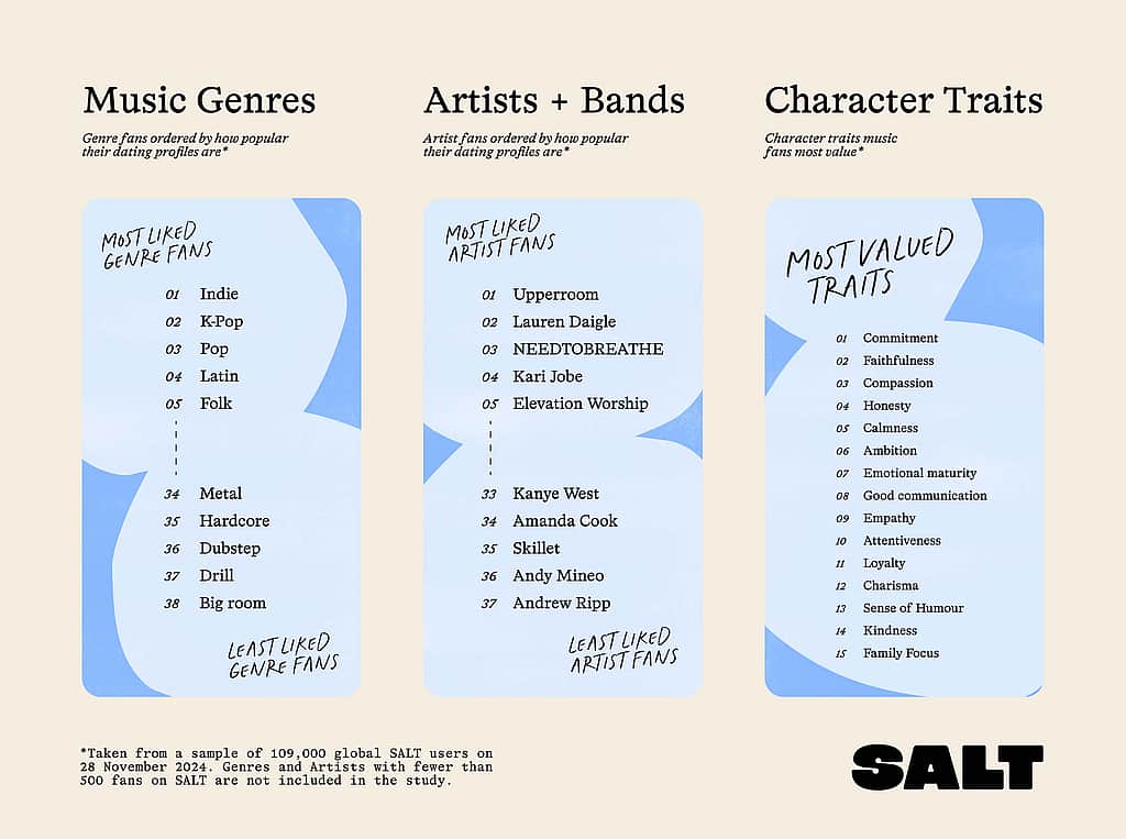SALT se je nekoliko poglobil in preučil temeljne vrednote, značilnosti, ki se najbolj odzivajo na najbolj priljubljene profile in so med njimi najbolj priljubljene. Smisel za humor in čustvena zrelost sta na vrhu seznama lastnosti, ki jih oboževalci Indie cenijo pri sebi ali pri partnerju, tesno pa jima sledijo iskrenost, empatija, sočutje in zvestoba. Tudi oboževalci Lauren Daigle in Upperroom so jih uvrstili visoko.